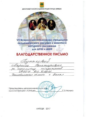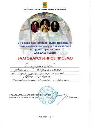 Благодарственные письма преподавателям Смирновой Е.И. и Бунаковой Л.В. за подготовку учеников к VII Всероссийскому конкурсу "Традиции академического рисунка и живописи"