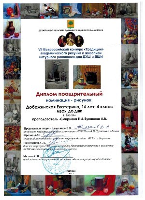 Добржинская Екатерина - дипломант VII Всероссийского конкурса "Традиции академического рисунка и живописи"