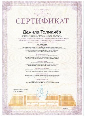 Толмачев Данила - Сертификат о посещении мастер-классов в рамках обучения в творческом лагере "Сириус"