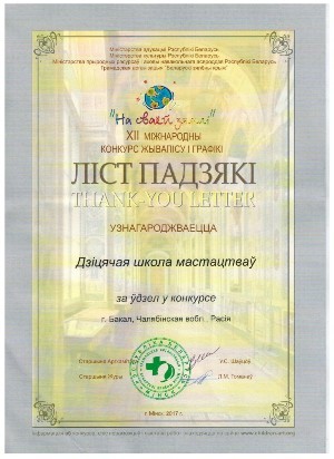 Благодарственное письмо школе искусств от организаторов XII Международного конкурса живописи и графики "На своей земле"