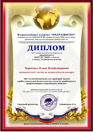 Черненко О.В. – заняла 1 место во Всероссийском конкурсе «ИКТ-компетентность как критерий оценки профессиональной деятельности согласно требованиям профстандарта современного педагога»