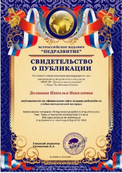 Публикация открытого урока «Вальс в творчестве композиторов 19 века»